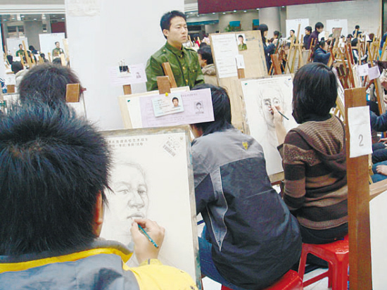 8时,素描考试开始。每一名模特前,十几名考生分别在不同角度支起画板,静静地勾勒着模特的样子。据监考老师介绍,考生选择的角度都是他们入场前抽签确定的。“画纸由省招办统一提供,每名考生只有一张。”监考老师告诉记者,考试时间比较紧凑,接下来要进行速写和色彩两类考试,三科一天内全部结束,而考试全程均有纪委等相关部门监督,以防作弊。