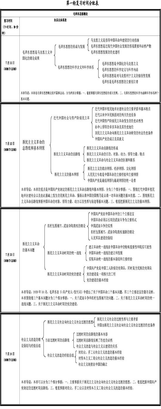 此次复习时间共两个月,分为两轮,第一轮复习时间定为7月1日---7月19月,复习内容为毛泽东思想概论和这两部分,主要是在新大纲下来前完成对政治主要的四大部分知识体系的梳理。