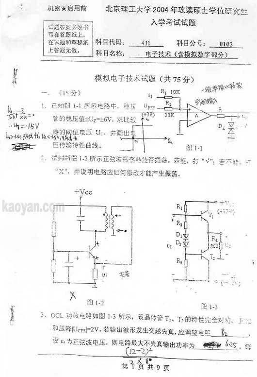 试题:(北理工)2004年电子技术(含模拟数字部分)