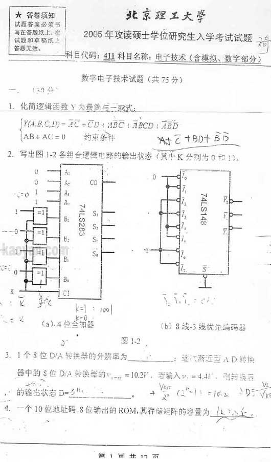 试题:(北理工)2005年电子技术(含模拟数字部分)