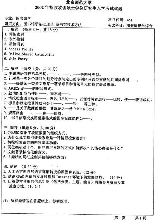 试题:(北京师范大学)2002年图书情报学综合